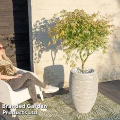 This striking Acer has been given the poetic name ‘Floating Cloud Maple’ due to its unusual, variegated foliage. Each leaf bears a unique pattern of pale green sprinkles against a cream background with a blush of pink spreading from the tips. Some leaves emerge completely cream whilst others are more speckled and their colours evolve during the growing season. The overall effect is stunning – forming a tree with a pale, floaty appearance – it’s especially striking set against a background of darker foliage. In autumn, the foliage develops rich yellow-orange tones before falling to unveil an elegant tracery of fine, tiered branches. Acers are slow growing and make ideal specimens for small gardens and containers where they provide multiple seasons of interest. Height and Spread: 250cm (98in).